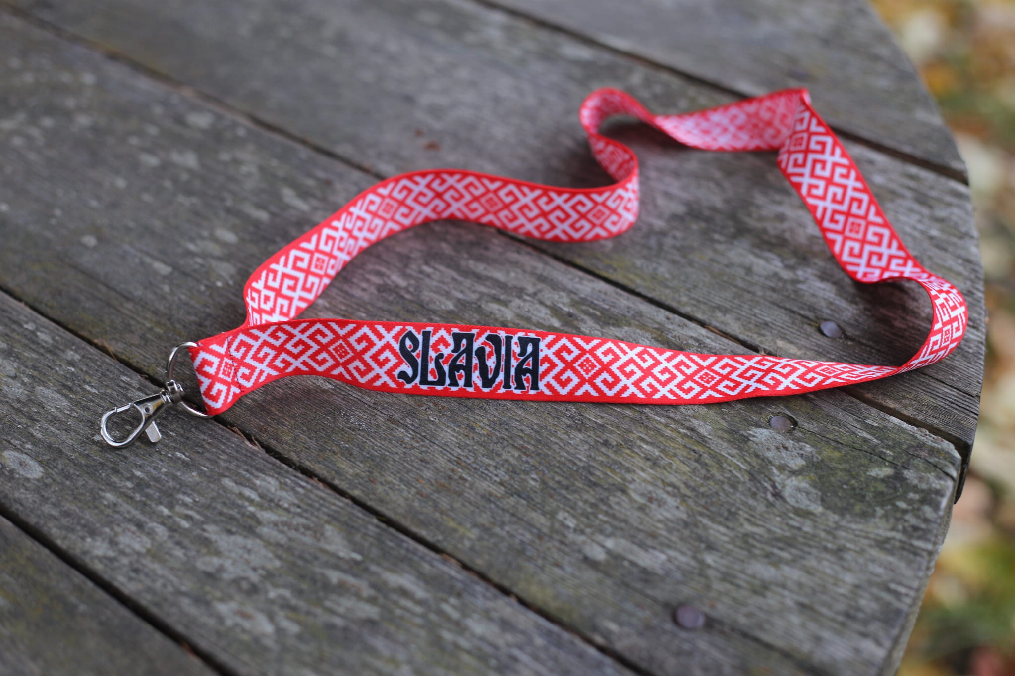 Smyczka na klucze w biało - czerwoną krajkę, dodatkowo posiada napis Slavia.